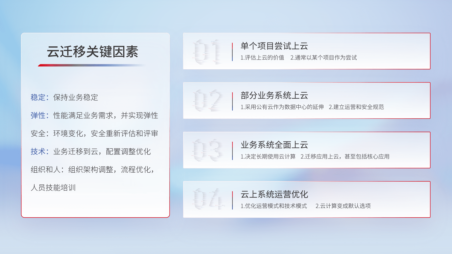 结合实际业务,,从规划设计、、云平台选型、、云原生改造、、、、数据迁移、、、集成交付,,迁移全过程为客户识别最佳上云路径,,,,做好风险识别管理,,,,设计网络架构、、、身份权限、、、安全审计合规、、、、操作审计、、日志审计、、、监控告警策略、、、多站点容灾设计等,,,,对云上基础设施进行整体规划,,,提升IT治理水平,,以满足弹性、、高可用、、、、高性能的需求。。。