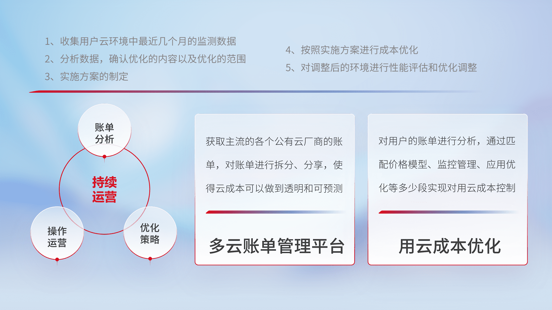 通过多云纳管,,,,以统一的资源数据模型把客户的云资源进行抽象和封装,,进而实现对多云资源的统一操作,,,保障云资源管理的可靠性、、稳定性与可用性。。。。量身定制化运维内容,,,配置、、开发运维、、、补丁管理、、、备份、、、监控、、、、认证和访问管理、、审计和日常巡检等,,,,保障在用云过程中的可靠度,,稳定度以及高可用率。。。